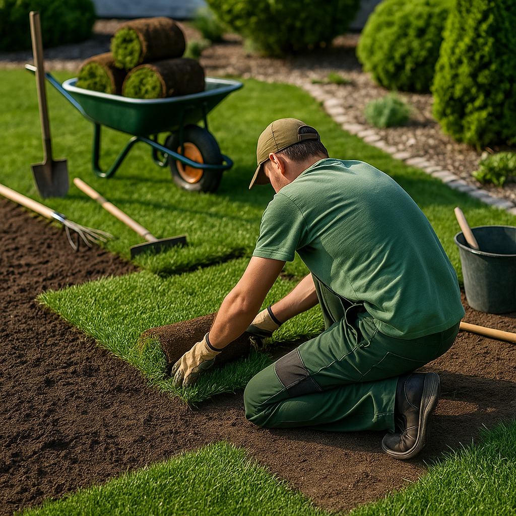 Preparação do solo, nivelamento e aplicação profissional de grama